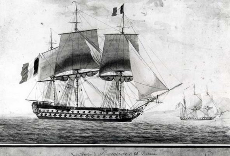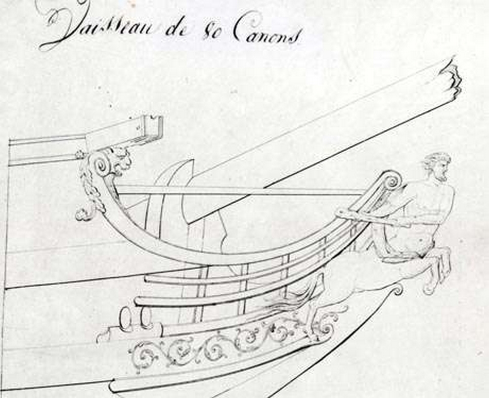 Étudions également une autre fameuse aquarelle représentant le Bucentaure (ci-dessous). La légende qui figure sur cette œuvre dit : « Le Bucentaure de 86 canons, commandé par le capitaine Magendie officier de la Légion d’Honneur. Le 20 fructidor an XI (7 septembre 1803). » C’est la date à laquelle Jean-Jacques Magendie, commandant le bâtiment, prit pied sur le Bucentaure à Toulon. C’est vraisemblablement un dessinateur local de Toulon ou de Rochefort qui est l’auteur de cette œuvre, qui n’est d’ailleurs pas signée. Magendie n’était pas riche, mais cette œuvre aussi modeste qu’elle soit et d’une exécution un peu naïve, semble fidèle et donne une idée assez juste du vaisseau tel qu’il était. Étant donné la date de réalisation de cette œuvre, le peintre devait avoir le modèle sous les yeux. On peut y distinguer la figure de proue du 80 canons : un centaure, mi-homme mi-cheval. La figure semble identique à celle représentée sur le document de la British Library, ci-dessus. Toutefois, elle se distingue toutes les deux de celle représentée par Auguste Mayer sur son œuvre, notamment en ce qui concerne la position des bras du centaure. Cette différence peut pour autant aisément s’expliquer par le fait que Mayer n’ait jamais vu de ses propres yeux le Bucentaure, sa seule source d’information étant quelques témoignages et descriptions orales de personnes ayant effectivement vu le 80 canons français..