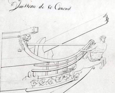 Très honnêtement, je ne sais pas. En 1786, une décision ministérielle impose la décoration des nouveaux vaisseaux, la figure de proue devenant dés lors un simple écusson aux trois fleurs de lys, surmonté de la couronne royale. Sous la Révolution, on « réactualise » l’écusson, on gratte les fleurs de lys et on remplace la couronne royale par le bonnet phrygien. Mais cette disposition est peu respectée, il est donc fort possible que le Redoutable – construit de mémoire au début des années 1790 – ait eu une figure de proue « personnalisée ».