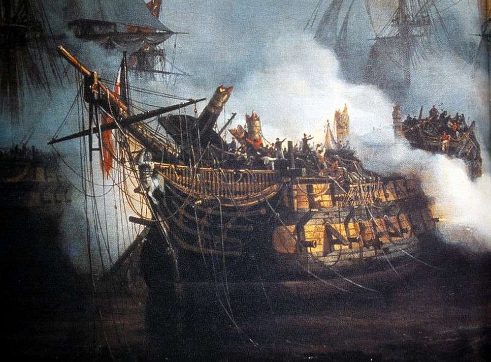 Mais on peut également très bien imaginer, en étudiant le récit de la bataille, que le trois-ponts représenté soit en fait le Neptune anglais. Je rappelle à ce propos que la colonne de Nelson comptait quatre trois-ponts à Trafalgar : le Victory et le Temeraire qui ont combattu le Bucentaure puis Le Redoutable, le Britannia, et le Neptune qui, selon des rapports, a également lâché quelques bordées sur le Bucentaure avant de s’en prendre à la Santissima Trinidad espagnole :