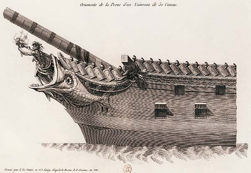 De la gueule d’un poisson sort, sous les traits d’une divinité antique ou de Jonas, un homme portant deux flambeaux. Cette planche, Ornements de la proue d’un vaisseau de 50 canons, est extraite d’un recueil de vingt-cinq gravures exécutées par Yves Le Gouaz et Jacques-Joseph Coiny d’après le dessin de l’artiste brestois Pierre Ozanne (1737-1813), maître dessinateur des gardes de la Marine et ingénieur constructeur. À l’invitation du ministre Bruix, il conçut ces projets pendant le congé de trois mois qu’il passa à Paris en 1798. Les proues sont ornées de figures de guerriers, de dieux de la mythologie, de têtes d’animaux et de poissons monstrueux : ces motifs ne furent jamais réalisés.