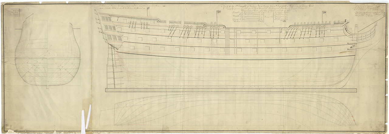 Le vaisseau à trois-ponts est le fameux Temeraire britannique, surtout connu pour avoir participé à la bataille de Trafalgar, le 21 octobre 1805. Mis en chantier en juillet 1793, le Temeraire est lancé à Chatham Dockyard le 11 septembre 1798. Il fait partie des trois trois-ponts (avec le Neptune et le Dreadnought) dits de 98 canons, issus des plans réalisés par John Henslow, construits par les Anglais dans les années 1790. Le navire porte en vérité 108 canons puisqu’il est armé de 28 canons de 32 livres anglaises dans sa batterie basse, 30 canons de 18 livres dans sa deuxième batterie, 30 autres canons de 18 livres dans sa batterie haute, ainsi que 10 canons de 12 dans ses gaillards. On remarque ici que l’artillerie des vaisseaux anglais et français était disposée différemment : batterie basse moins puissamment armée chez les Anglais (32 livres contre 36 chez les Français, sachant que la livre anglaise était inférieure à la livre française), même calibre porté par les deuxième et troisième ponts (tandis que les trois-ponts français avaient à cette époque du 24 dans la deuxième batterie et du 12 dans la troisième).