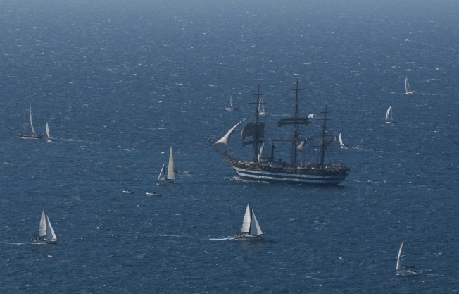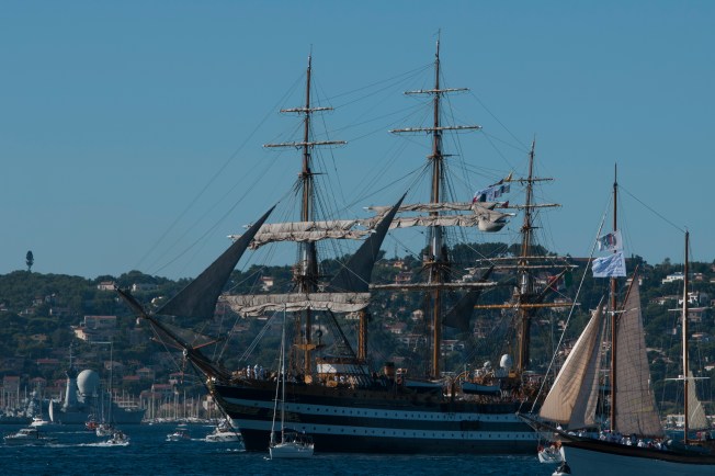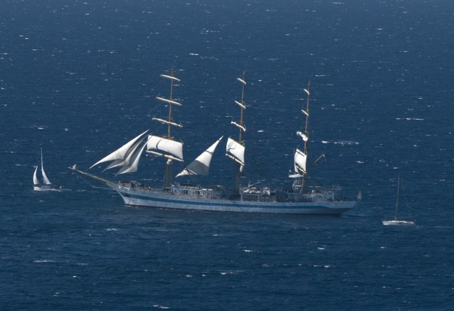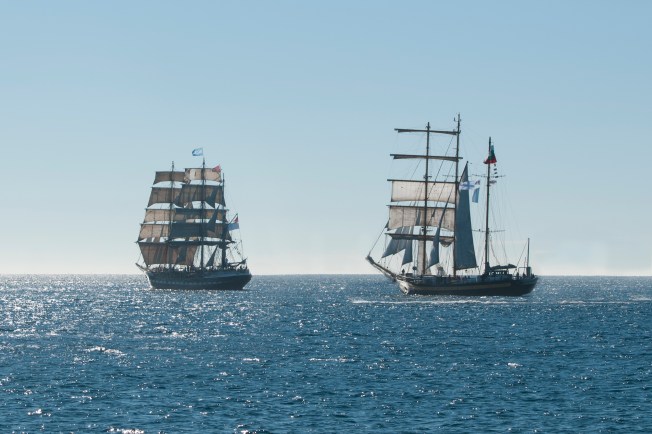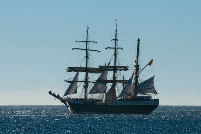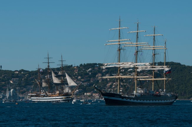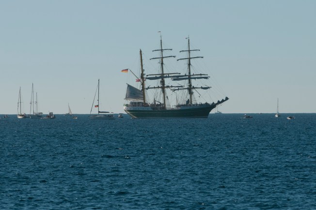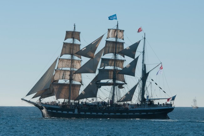 Le Kruzenshtern est le second voilier le plus grand du monde, il détient le record du monde du voyage le plus rapide pour les grands voiliers. En arrière plan, à gauche, l’Amerigo Vespucci italien.