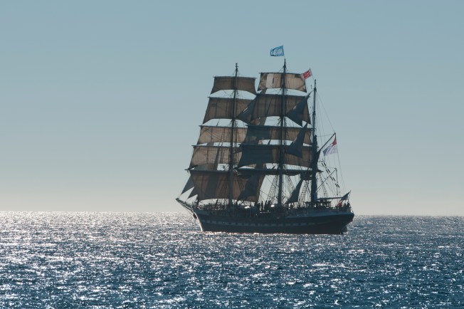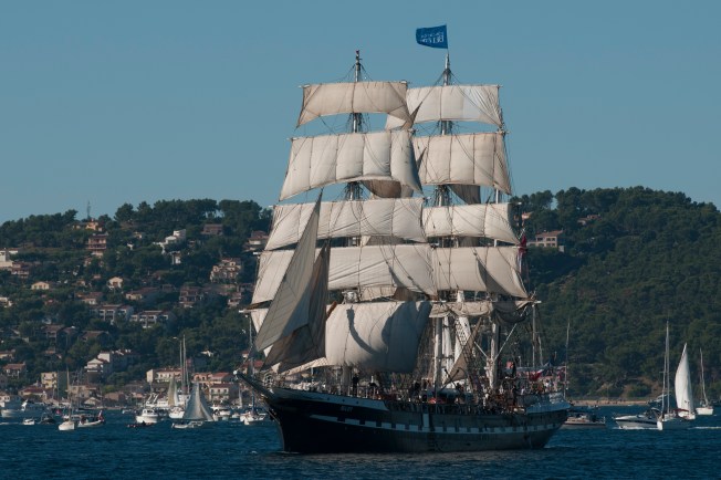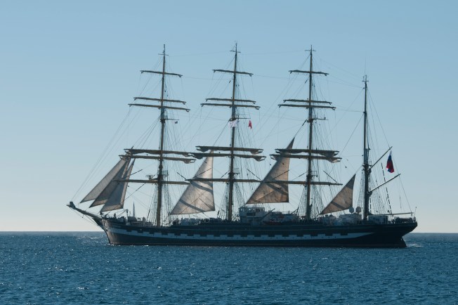 Le Kruzenshtern, voilier russe de quatre mats. Construit en Allemagne en 1926 sous le nom de « Padoue », il est l’un des cinq clippers alors réalisés pour le « Flying P Line » et le dernier navigant à ce jour.