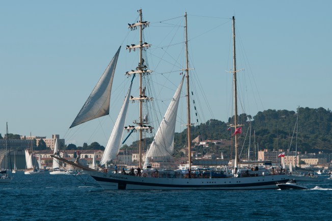 Le Mir. Immédiatement reconnaissable à sa coque blanche striée de bleu et de rouge, le voilier Russe dont le nom signifie la « paix » mesure près de 110 m de long, ce qui en fait l’un des plus grands bateaux à voiles du monde. C’est aussi le plus rapide.