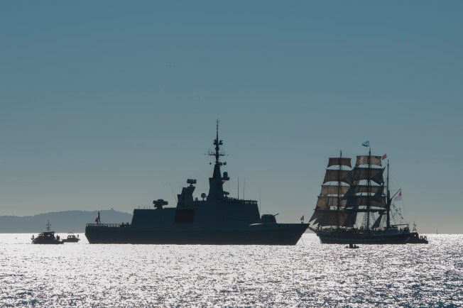 Symbole d’un siècle d’évolution de la construction navale. Le Belem croise la frégate de la Marine nationale Guépratte (F714), bâtiment de type La Fayette.