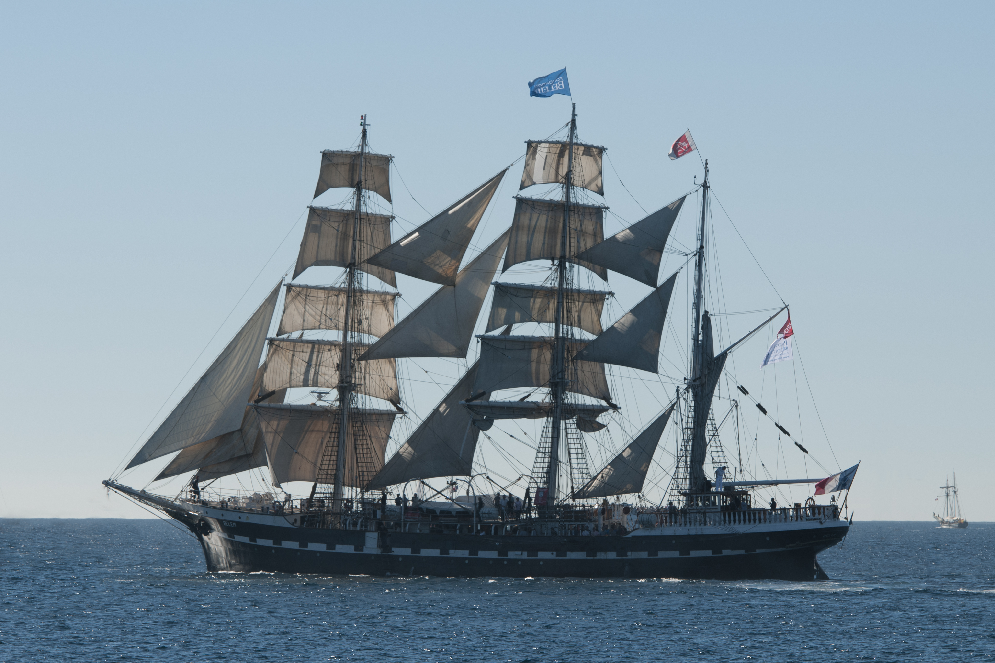 Le Kruzenshtern, voilier russe de quatre mats. Construit en Allemagne en 1926 sous le nom de « Padoue », il est l’un des cinq clippers alors réalisés pour le « Flying P Line » et le dernier navigant à ce jour.