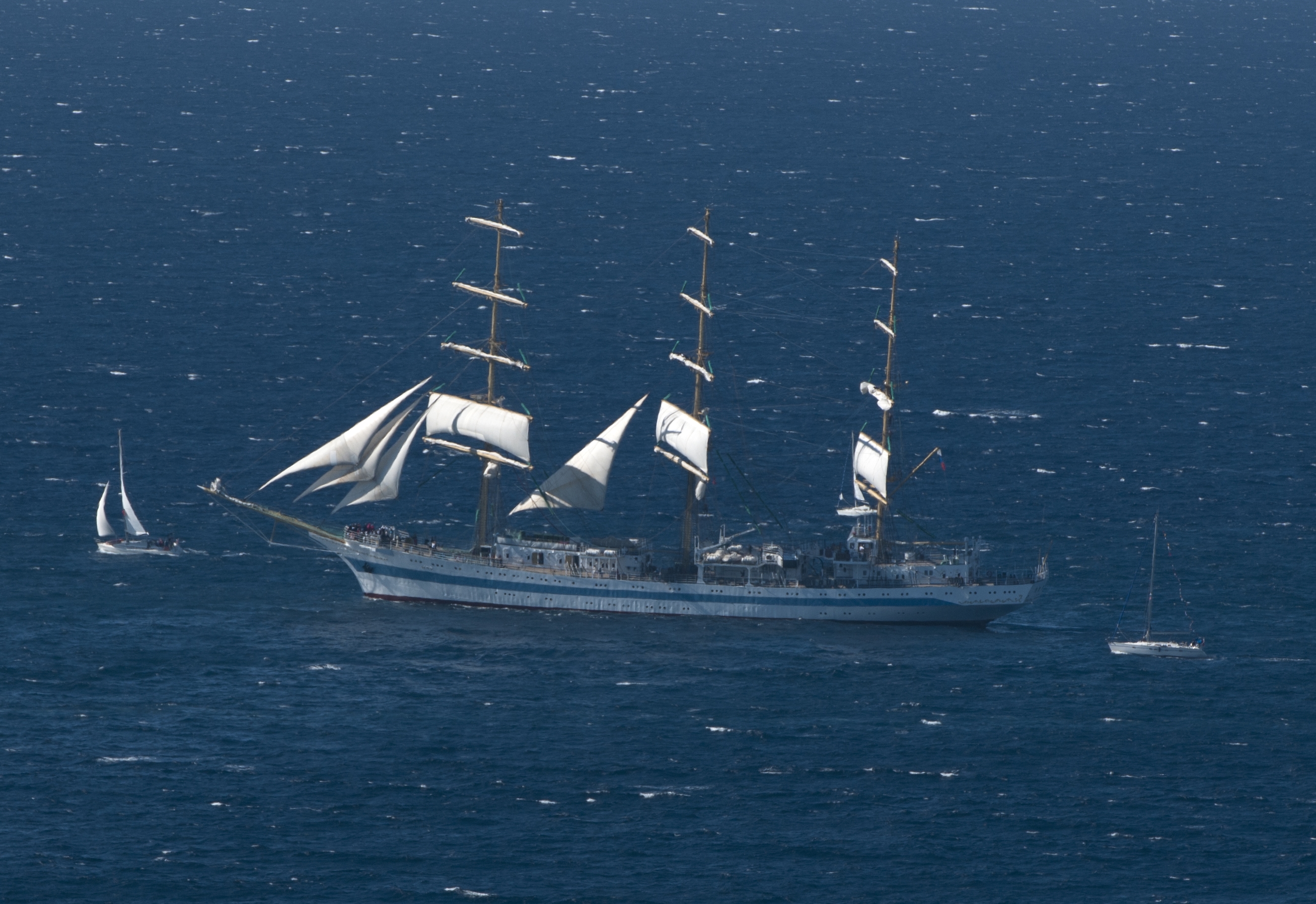 Le Kruzenshtern est le second voilier le plus grand du monde, il détient le record du monde du voyage le plus rapide pour les grands voiliers. En arrière plan, à gauche, l’Amerigo Vespucci italien.