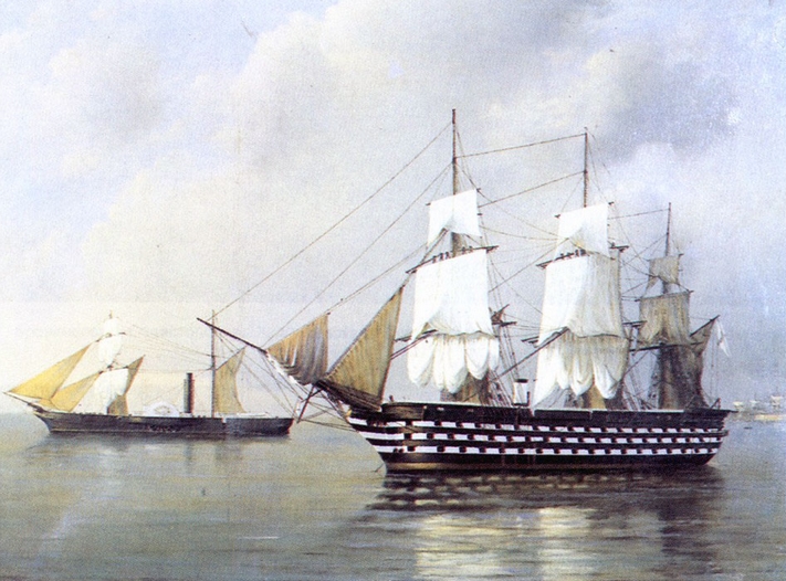 Au début de la décennie 1850, à la veille de la guerre de Crimée, la Russie possède la troisième marine d’Europe. La flotte de la mer Noire (au Sud) compte 16 vaisseaux à voiles, 7 frégates à voiles, 7 frégates à vapeur et 4 corvettes à voiles. La flotte de la Baltique (au Nord) possède quant à elle 26 vaisseaux à voiles, 14 frégates à voiles, 9 frégates à vapeur et 2 corvettes à vapeur. On le constate, la majeure partie de la flotte russe est composée de voiliers. Le nombre de navires à vapeur est relativement insignifiant, tous sont à roues et non à hélice. La raison de ce retard sensible de la marine russe par rapport aux marines française et britannique s’explique alors essentiellement par le faible développement industriel de l’Empire ainsi que par le manque de bons matériaux de construction et de spécialistes. Pour construire des navires à vapeur, Saint-Pétersbourg est obligé de s’adresser à l’étranger, ce qui occasionne de grandes dépenses. Un effort est toutefois fait à partir de 1851-1852, années durant lesquelles deux frégates à hélice portant chacune 44 canons sont mises en construction. En 1853, deux vaisseaux à trois-ponts sont également mis en chantier, bien trop tardivement cependant pour participer au conflit, qui commence quelques mois plus tard.