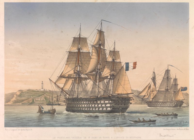 « Le Friedland, vaisseau de 1er rang en panne a l’entrée du Bosphore » par Lebreton. La scène se passe en 1853, l’escadre franco-britannique se dirige vers la Mer Noire au début de la guerre de Crimée.