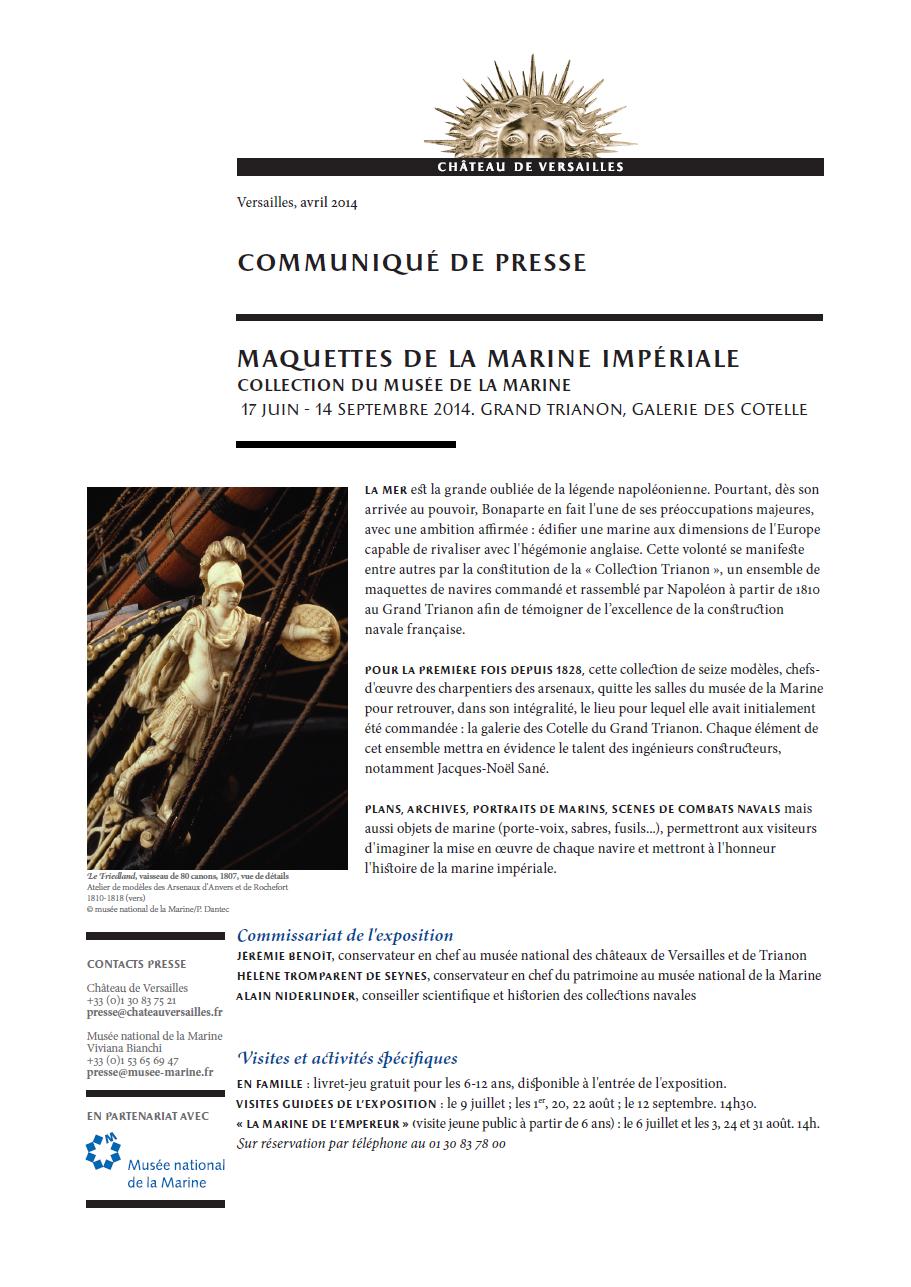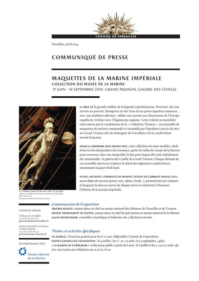 Je signale la tenue prochaine d’une très intéressante exposition : « Maquettes de la Marine impériale » qui aura lieu cet été (17 juin au 14 septembre 2014) au château de Versailles, dans la galerie des Cotelle du Grand Trianon, organisée en partenariat avec le Musée national de la Marine.