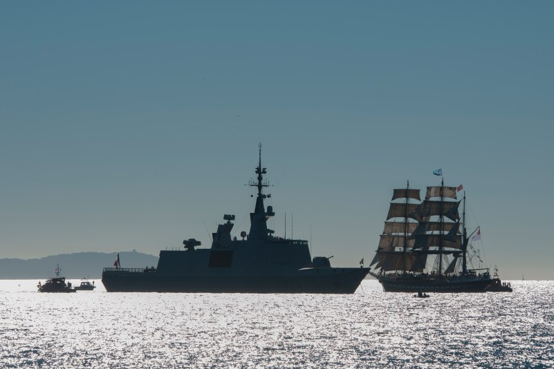 Pour conclure, une photo personnelle (déjà publiée sur Trois-Ponts!) prise le 30 septembre 2013, à l’occasion du passage de la Tall Ships Regatta à Toulon. Celle du Belem, le dernier des grands voiliers de commerce français du XIXème siècle encore naviguant, lancé à Nantes le 10 juin 1896, croisant la frégate de la Marine nationale Guépratte (F714), bâtiment de type La Fayette :