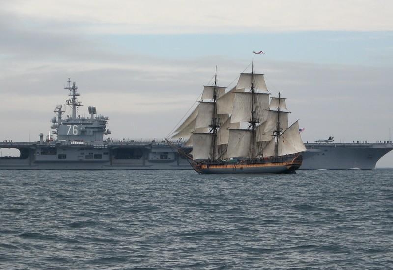 En Amérique du Nord, la HMS Rose, réplique d’une frégate anglaise du XVIIIe siècle, renommée HMS Surprise après avoir servi dans la réalisation du film Master and Commander en 2003, devant le porte-avions USS Ronald Reagan (CVN-76) au large de San Diego (date inconnue, années 2000) :