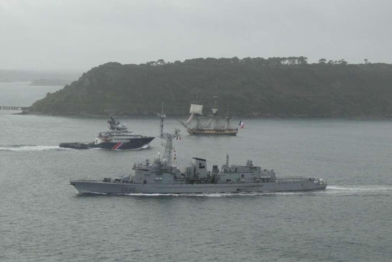 En France, l’Hermione, réplique construite récemment de la frégate de 12, lancée en 1779 à Rochefort et connue pour avoir conduit le marquis de La Fayette aux États-Unis en 1780, a également eu l’occasion de croiser des navires de guerre modernes. Deux photographies prises à Brest en octobre 2014 : sur la première, prise par M.Denniel, on y voit la frégate française devant le BPC Dixmude (L9015) et l’aviso Lieutenant de vaisseau Lavallée (F790) ; sur la seconde, elle navigue au coté de la frégate Latouche-Tréville (D646), scène hautement symbolique, le commandant de l’Hermione ayant été, entre 1779 et 1782, le capitaine Latouche-Tréville (qui fut fait vice-amiral en 1803).