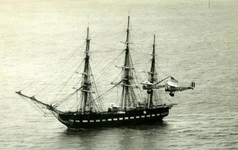 Bien qu’aucune unité navale n’y soit véritablement visible, nous ne pouvons pas nous empêcher de publier les deux photographies suivantes. Sur la première, la Constitution arrivant à New York en 1931, puis, sur la seconde, survolée par plusieurs biplans d’observation, à peu près à la même époque :