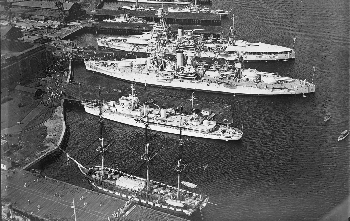 Bien qu’aucune unité navale n’y soit véritablement visible, nous ne pouvons pas nous empêcher de publier les deux photographies suivantes. Sur la première, la Constitution arrivant à New York en 1931, puis, sur la seconde, survolée par plusieurs biplans d’observation, à peu près à la même époque :