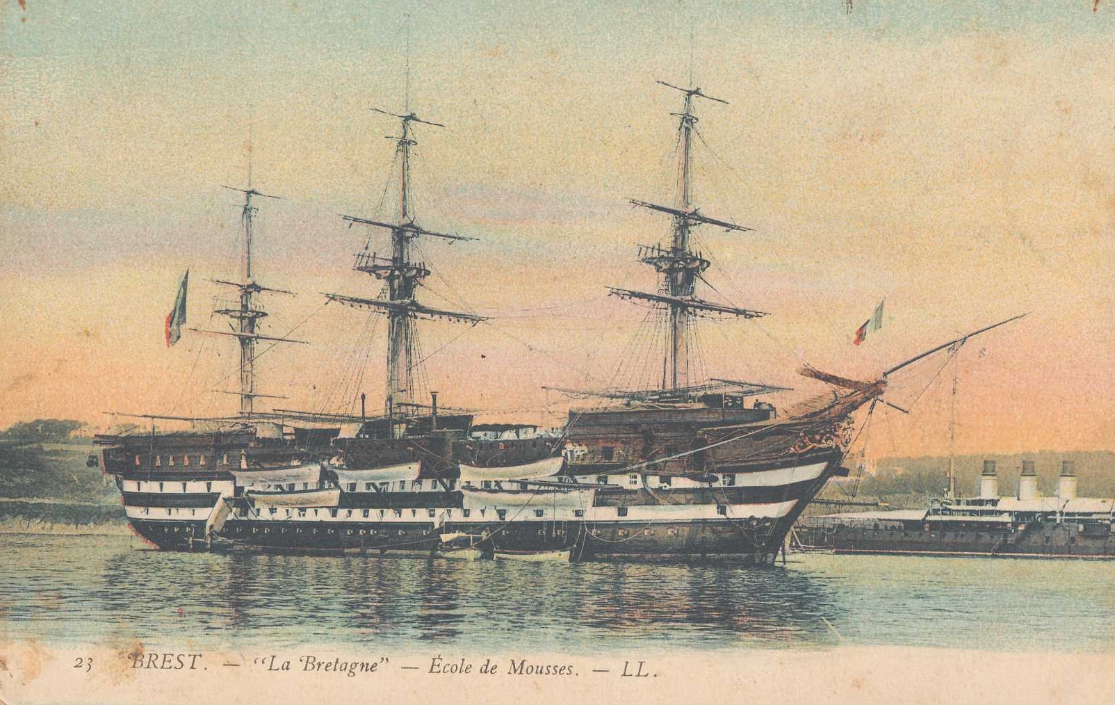 Sur la photographie ci-dessus est également visible la Bretagne, qu’il ne faut pas confondre avec le fameux trois-ponts la Bretagne lancé à Brest en 1855 et rayé des listes en 1879. Il s’agit en fait ici de l’ex-Fontenoy, vieux vaisseau de 90 canons de type Suffren, dont le plan a été adopté durant la Commission de Paris de 1824, mis en chantier à Toulon en 1827. Quasiment terminé (son avancement est des 21/24 en 1835), il est toutefois laissé sur cale, où il est transformé en mixte au milieu des années 1850 puis enfin lancé le 2 décembre 1858. Après une carrière assez peu mouvementée, durant laquelle il participe notamment à la campagne du Mexique en 1862, il est en 1894 renommé la Bretagne et dévient école des mousses. Il le restera jusqu’en 1910.
