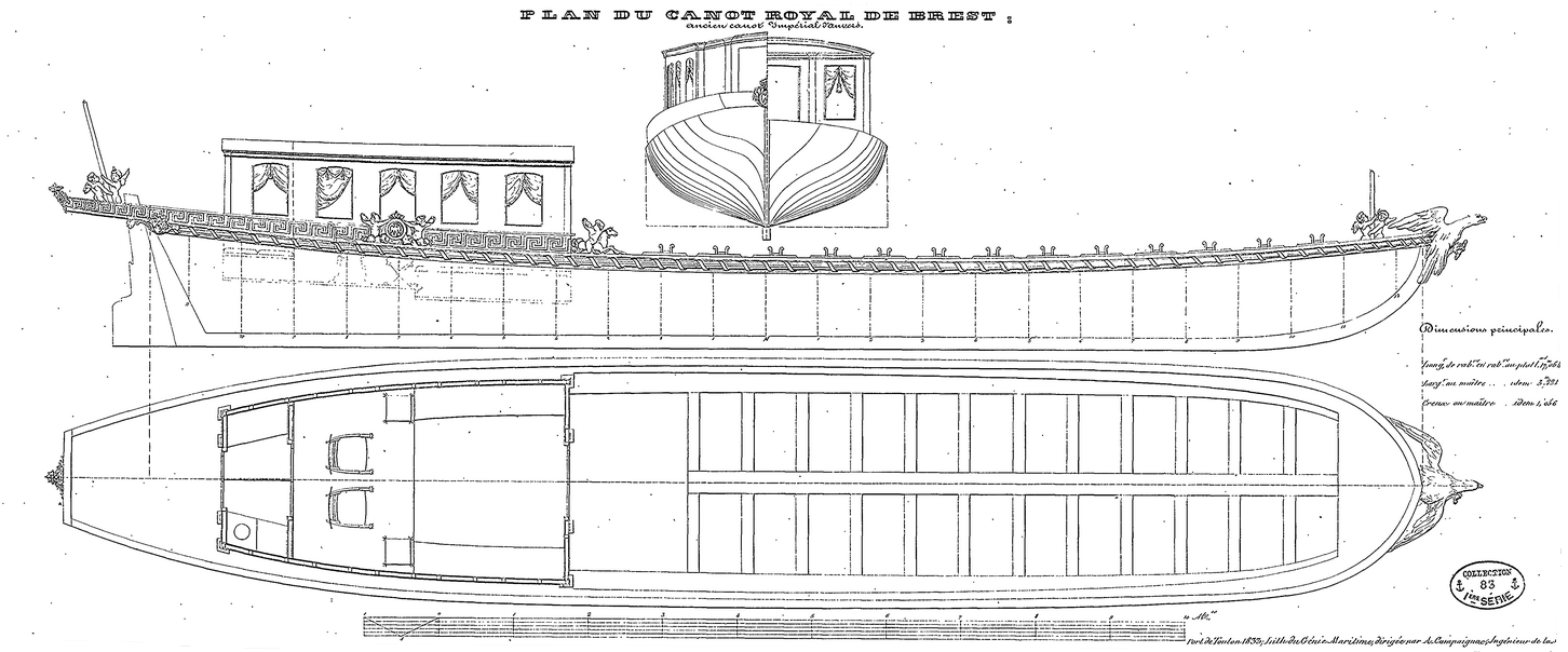 Sous la Restauration, l’embarcation est nommée « Canot royal de Brest ». Extrait de l’Atlas du Génie maritime, fin du XIXe siècle. Bibliothèque du musée national de la Marine. On constate que sa décoration, la figure de proue notamment, est encore différente de celle d’aujourd’hui.