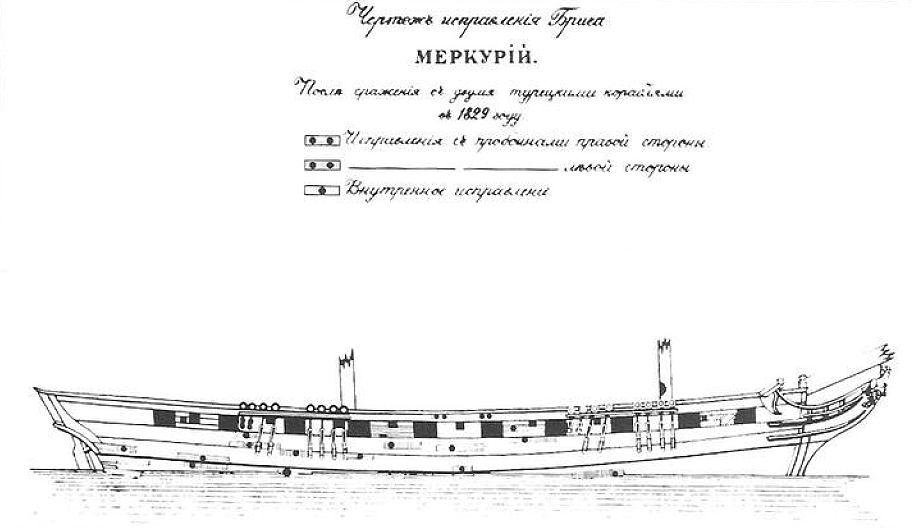 Durant les derniers mois de la guerre russo-turque de 1828-1829, le 14 mai 1829, le Merkourii, accompagné de la frégate Shtandart (Штандарт, Étendard, du nom de la frégate du tsar Pierre le Grand, premier navire de la flotte de la Baltique en 1703) et du brick Orfey (Орфей, Orphée), croisent à la sortie du détroit du Bosphore et aperçoivent au loin une escadre turque composée de plusieurs vaisseaux se dirigeant sur eux. De force bien inférieure, les trois navires n’ont d’autre choix que de fuir. Mais, tandis que le Shtandart et l’Orfey forcent de voile pour rallier la flotte russe, le Merkourii, mauvais marcheur, reste en arrière. Deux vaisseaux turcs – un trois-ponts de 120 canons, le Selimiye, et un deux-ponts de 74 canons, le Real Bey – se détachent de l’escadre pour le prendre en chasse. (A noter que le Selimiye a été construit par l’ingénieur français Jacques Brun de Sainte-Catherine en 1797.)
