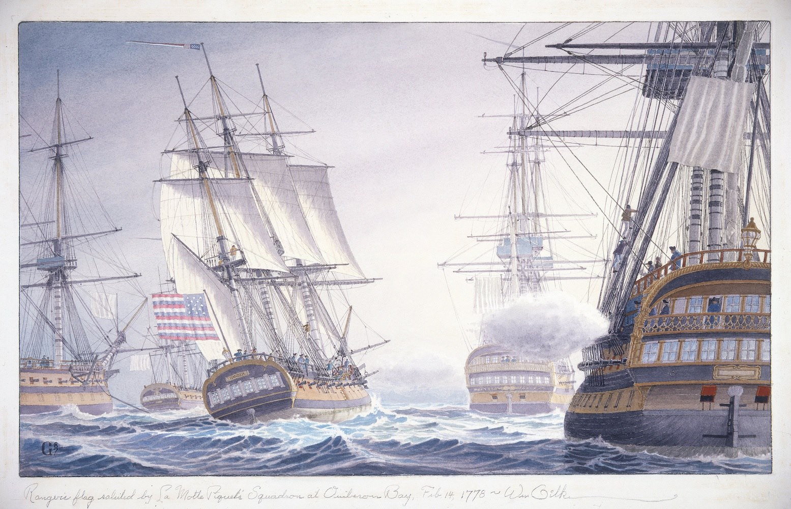 Événement symbolique : le 14 février 1778, en baie de Quiberon, le vaisseau français le Robuste, portant la marque du comte de La Motte Picquet, salue au canon la corvette américaine Ranger, commandée par le capitaine John Paul Jones. Le 74 canons français tire neuf coups de canon en retour des treize coups tirés par le navire américain.