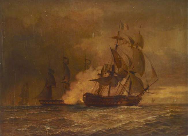 Combat du Guillaume Tell contre la frégate HMS Pénélope (30 mars 1800). Le vaisseau fuit devant une force supérieure apparue à l’horizon : il est poursuivi par une frégate anglaise, plus rapide, qui réussit à lui administrer plusieurs volées en poupe et qui parvient à le démâter de son grand mât et de son mât d’artimon, privant le Guillaume Tell de toute possibilité de manœuvrer. Peinture d’Arthur Ackland Hunt (1841-1914).