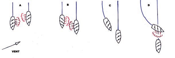 Schéma de la manœuvre destinée à permettre au bâtiment combattant au vent, de tenter d’administrer une volée en poupe à son adversaire.