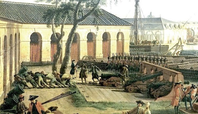Entraînement des canonniers français en 1755. L’instruction s’effectuait en partie dans des répliques de batteries de vaisseaux édifiées à terre, dans des conditions assez différentes de celles qui prévalaient à la mer. (Détail de la Vue du parc d’artillerie de l’arsenal de Toulon, par Joseph Vernet. © MnM ref.5-OA-2D