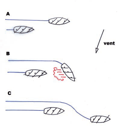 Manœuvre du Souverain poursuivi par HMS Hercules, dans la soirée du 10 octobre : les deux vaisseaux courent au près, l’anglais légèrement sous le vent (A). Le Souverain fait une brusque arrivée et sert à son poursuivant une volée en proue (B), avant de reprendre prestement sa route au près (C). Cette manœuvre parait simple, mais elle doit être préparée avec soin et discrétion afin de surprendre l’adversaire (qui pourrait lui aussi abattre). Elle exige une très rapide réaction des canonniers qui doivent exécuter leur tir pendant le très court moment où la proue de l’ennemi est à portée. Les pièces ont sans doute été orientées légèrement en retraite avant la manœuvre pour faciliter le tir (le tir « en belle » aurait nécessité que le Souverain abatte jusqu’au largue). C’est sans doute cette manœuvre qui permit de faire tomber le mât de hune de l’anglais : au tir en enfilade, la mâture est plus facile à atteindre qu’au combat bord à bord.