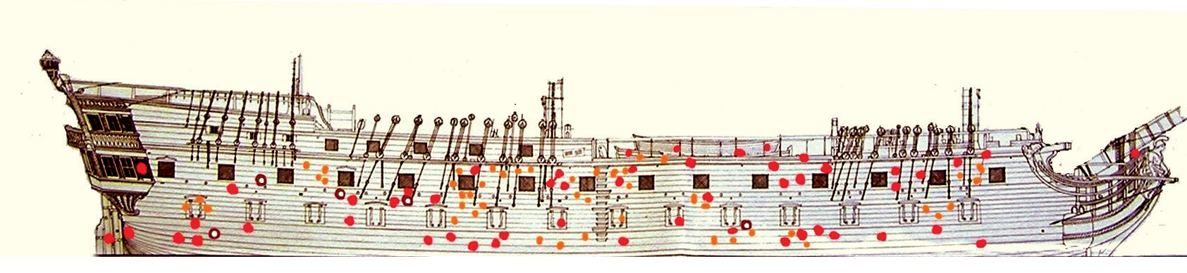 Les 56 impacts constatés sur la muraille de tribord (au vent) du Souverain après la bataille du 17 août 1759. Les impacts de boulets sont en rouge. On a distingué (brun foncé et centre blanc) la trace des boulets qui ont atteint le vaigrage : ce sont les seuls (avec ceux qui ont pénétré par les sabords) qui ont pu causer des dommages corporels dans la batterie, principalement par les éclats de bois qu’ils ont provoqués. Les impacts de mitraille sont représentés en orange : on remarque qu’ils sont particulièrement nombreux entre les 6e et 9e sabords de la seconde batterie (un boulet à deux têtes s’est perdu sur la muraille, entre le 7e et le 8e sabord). La muraille bâbord (sous le vent) n’a reçu que trois boulets. (Profil d’un vaisseau de 74 canons, Jean Boudriot)