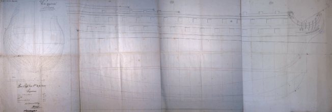 Plan du vaisseau de 74 canons le Souverain construit en 1757 par l’ingénieur Pomet. (© SHD Toulon ref. 1L 443/4, n° 30)
