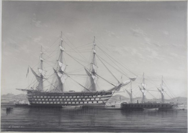 Le vaisseau-école des canonniers Louis XIV et la batterie flottante Dévastation, son annexe de 1866 à 1870, par Antoine Fremy, XIXe siècle. Musée des Beaux-Arts de Bordeaux.