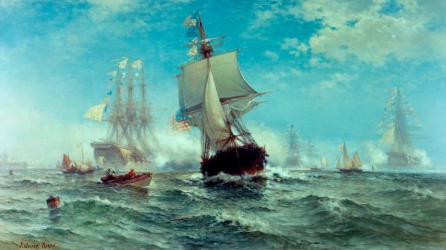 La Marine française saluant la bannière étoilée pour la première fois. Par Edward Moran (1829-1901), U.S. Naval Academy Museum